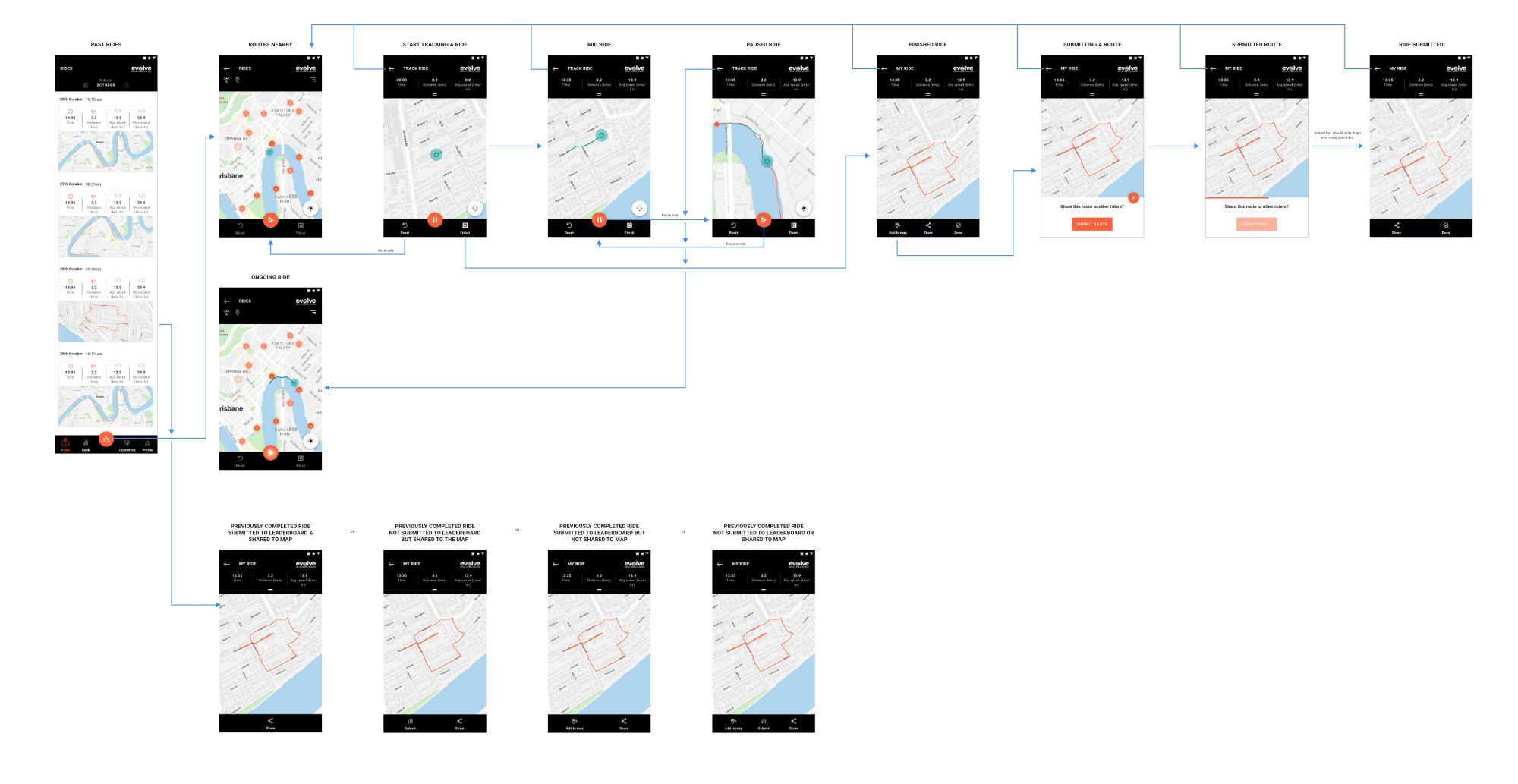 Evolve's branding included a minimal colour scheme that consisted of a single bright orange against black. We explored many different aesthetic options based on this, keeping in particular mind, how maps and GPS tracking features would look in different colour schemes.