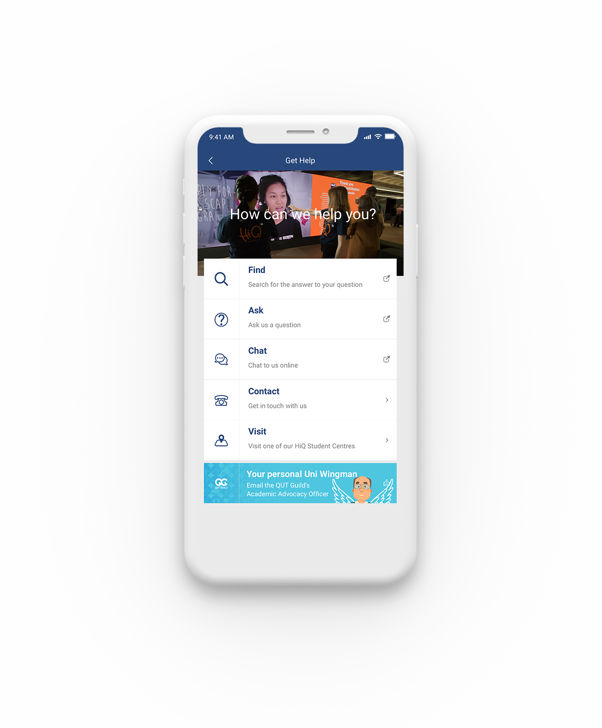 The Get Help feature is a hub of contact points available for students in their time of need. The idea was to create a simple point of call in which they could get access to whatever help they needed, in whatever contact method suited them.