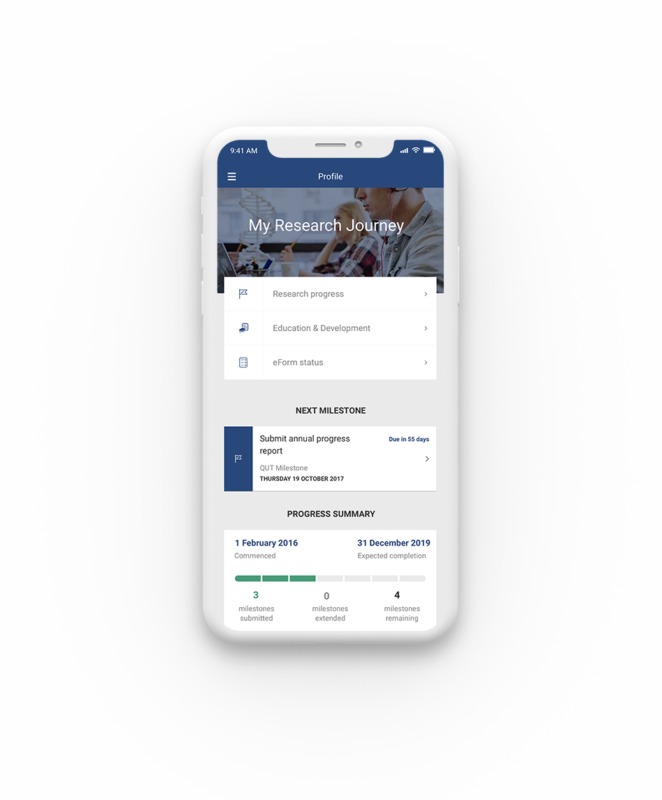 Higher Degree of Research (HDR) students required a dashboard to manage their post-graduate degree. This included a progress summary, information about their next milestone due, links to educational events, and relevant information about their scholarship.