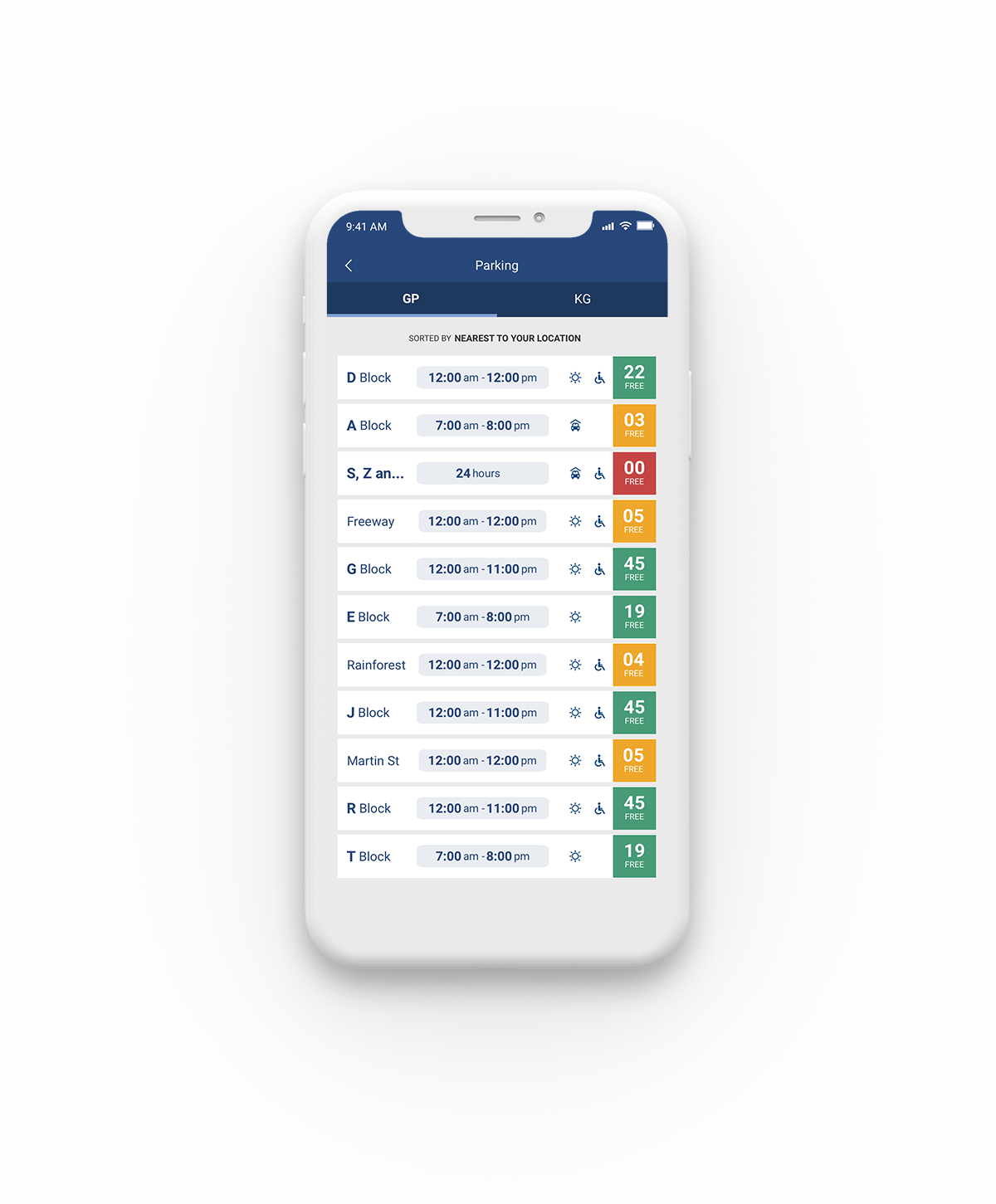 A list of all the parking facilities around campuses with the number of available spots. A map view of the parking feature was also developed.