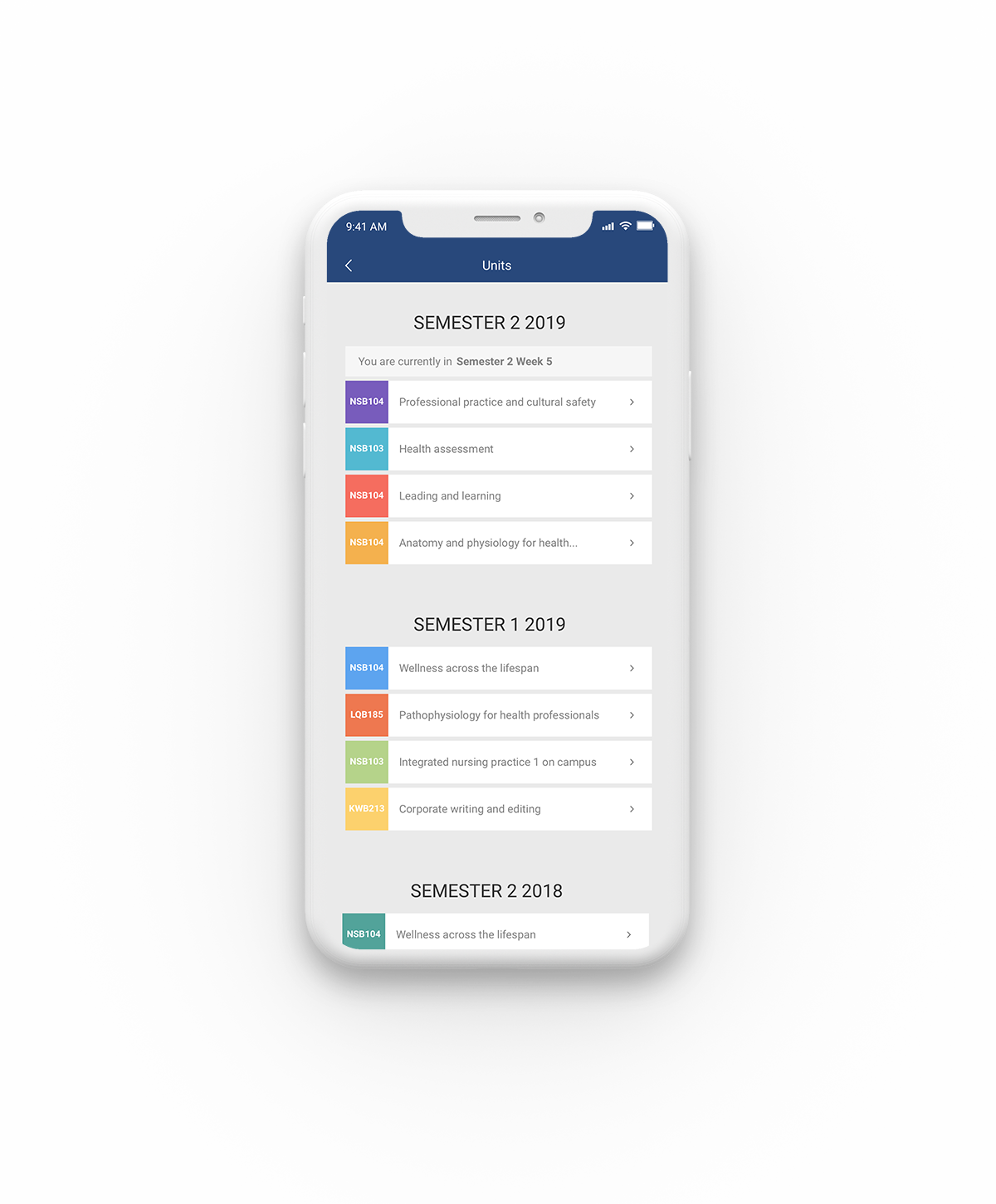 The units feature is an extensive overview of all the units a student has enrolled to in the past and present. Students have access to their teachers contact information, an overview of the assessments required, exams, and their grades achieved.