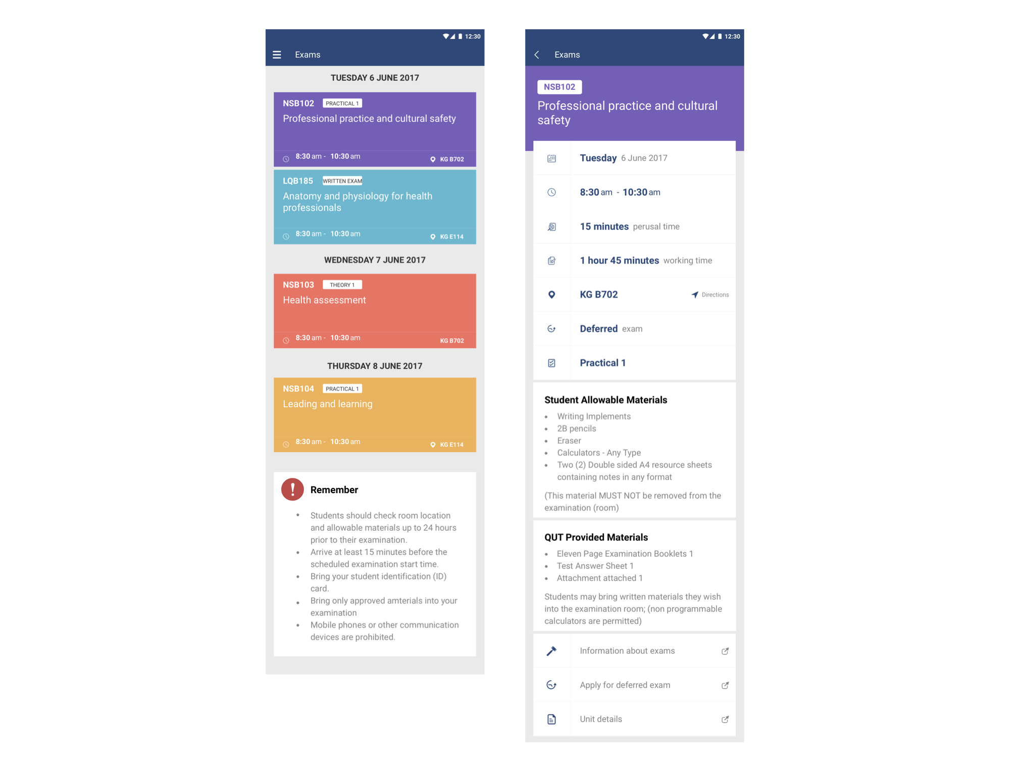 The calendar encompasses the class timetable, events the student may have signed up to using the QUT event system, exams, and assessment due dates. Students are able to create events and reminders for themselves based on how they personally like to manage their time.